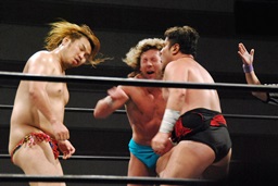 3人とも立ち上がってパンチの打ち合い(左写真)。