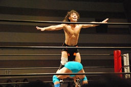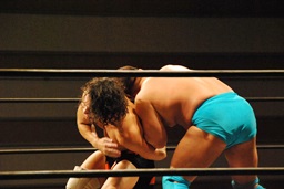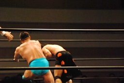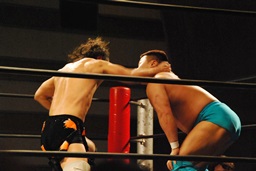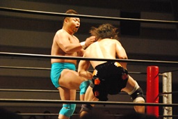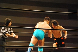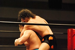 ロックアップ、すぐにブレーク。手四つ(左写真)、高梨腕を取る、松永切り返してヘッドロック。