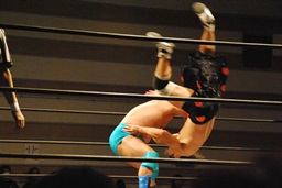 松永ロープに飛んで突っ込む、高梨ロープを引き下げて(左写真)松永をエプロンに。