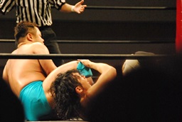 松永リングに戻ると高梨チンクラッシャー、ネックブリーカードロップ、スリーパー(右写真)、松永切り返す。