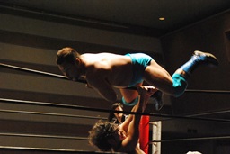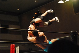 パワーボムの体勢(右写真)、ターンバックルに叩きつける。