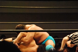 キーロックに(右写真)。「明日の朝まで絞るぞ!」いや、30分一本勝負だからそれは無理。高梨ロープ。5分経過。