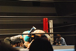 場外に出す(右写真)。高梨がリングに戻るとまた場外に出す。4回繰り返し。