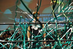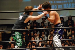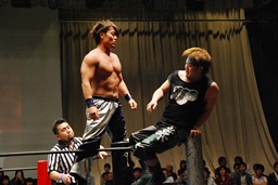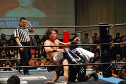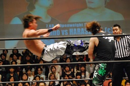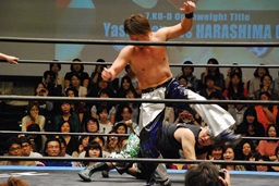 HARASHIMAサッカーボールキック連打(右写真)、片逆エビ、ウラノロープ。