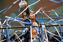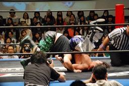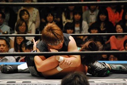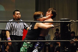 ウラノ足をすくってエビ固め(右写真)、カウント2。10分経過。