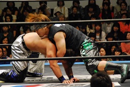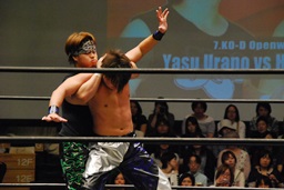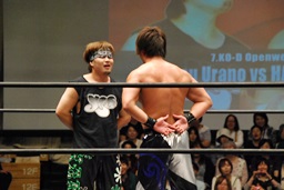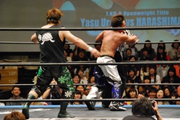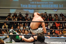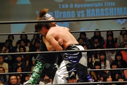 ロックアップ、HARASHIMAがロープに詰める、ウラノ切り返す(右写真)。