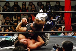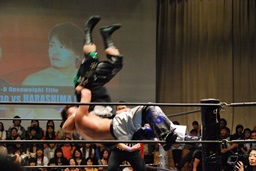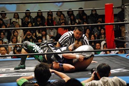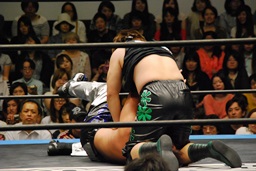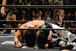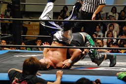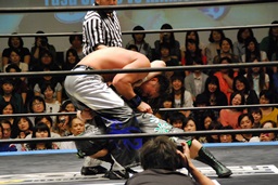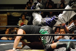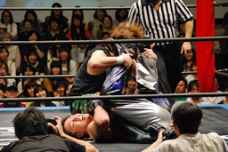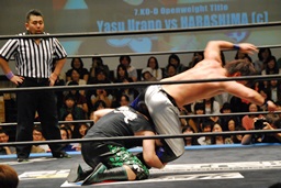 ウラノ背中で押さえ込む形に(左写真)、カウント2。