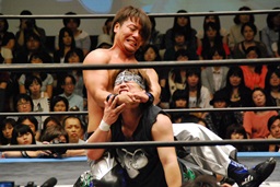 雪崩式ブレーンバスター(右写真)からファルコンアロー、カウント2。
