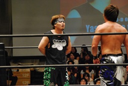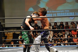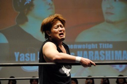 HARASHIMA背中にカカト落とし、ボディスラム、カウント1。HARASHIMAエルボー(右写真)、