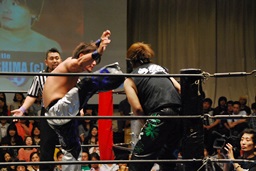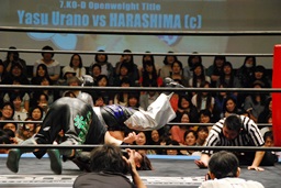 ウラノはHARASHIMAをコーナーに振るとすぐ後ろで四つんばいになってHARASHIMAを転ばし(左写真)、