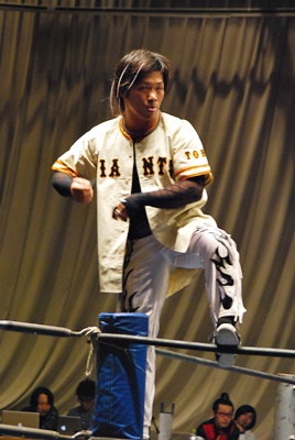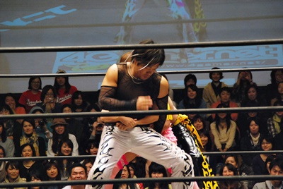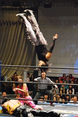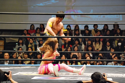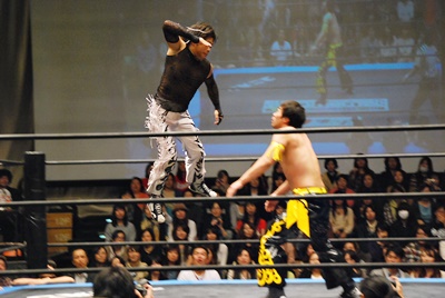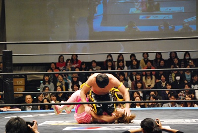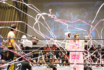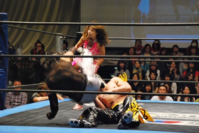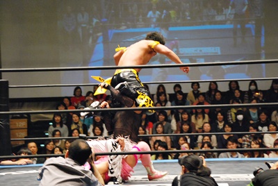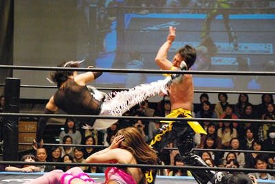 KUDOコーナーに上ってダイビングダブルニーアタック、MIKAMIかわす(左写真)。