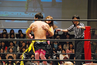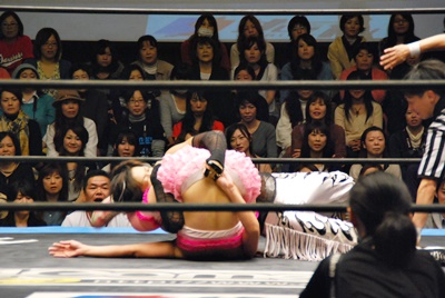 MIKAMI離れチェリーがKUDOにヘッドロック(左写真)、髪の毛をむしる。チェリーフライングメイヤー、KUDOヘッドシザーズでブレーク、MIKAMIフライングメイヤー、チェリーヘッドシザーズでブレーク、KUDOフライングメイヤー、MIKAMIヘッドシザーズでブレーク。