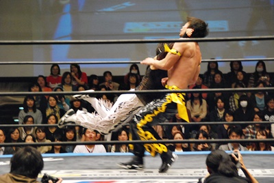 MIKAMIロープに振る、KUDO切り返す、MIKAMIフライングラリアット(左写真)。5分経過。