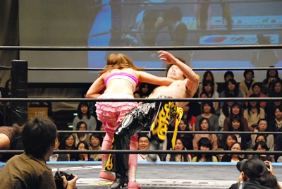 KUDOドロップキック(右写真)。チェリーがカバーに行くとKUDOストンピング。