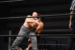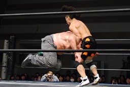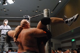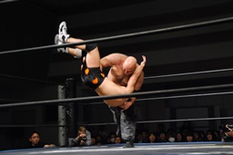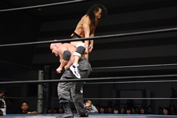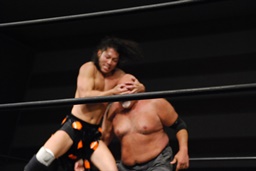 高梨ヘッドロック、星誕期持ち上げて投げ飛ばす(左写真)。