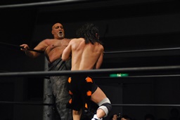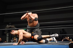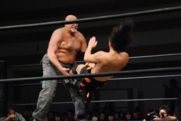 ロープに引っ掛けてドロップキック連発(左写真)、カバー、カウント2。