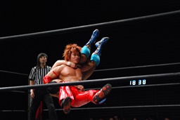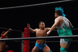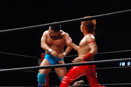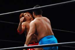 入江がエキサイトするが坂口は相手にせず。先発は松永と高尾。ロックアップ、松永ロープに詰めてチョップ(右写真)。再度ロックアップ、今度は高尾がロープに押し込むが松永体勢を入れ替えてまたチョップ。