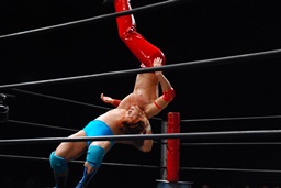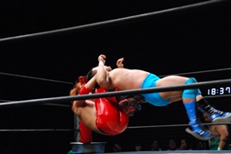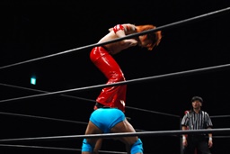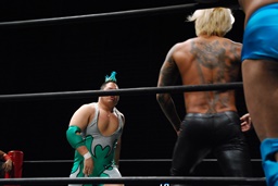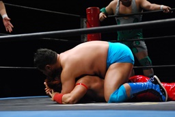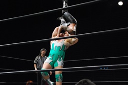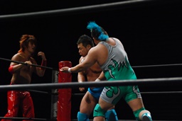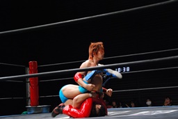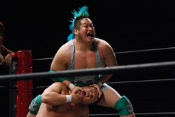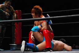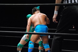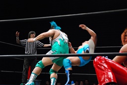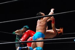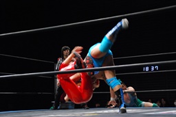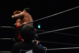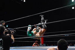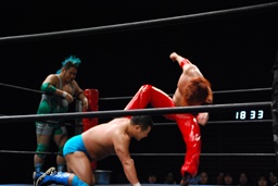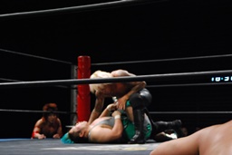 松永グラウンドに持ち込んでフェースロック(左写真)からヘッドロック、高尾切り返す、松永切り返してフライングメイヤー、高尾ヘッドシザーズ。松永もう一度フライングメイヤー、高尾ヘッドシザーズ。高尾は入江にタッチ。