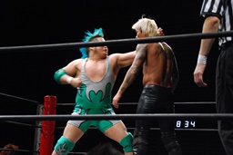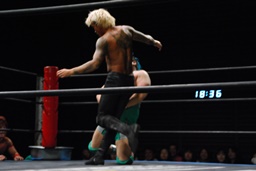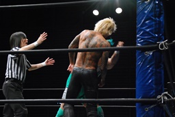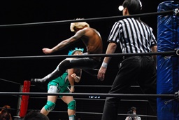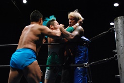 坂口が入ってくると松永をリリースして坂口にエルボー(左写真)、坂口ヒザ蹴り。高尾が入江を戻す。松永も坂口を制して試合続行。