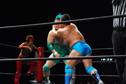 高尾コーナーに振って突っ込む、松永ショルダーブロック(左写真)、坂口にタッチ。高尾も入江にタッチ。