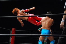 入江坂口がリングインする前に一直線に相手コーナーに突っ込み坂口を突き落とす(右写真)。前回後楽園の因縁引きずってるなあ。