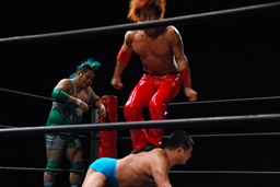 ヒザ蹴り(左写真)、松永にタッチ。入江も高尾にタッチ。