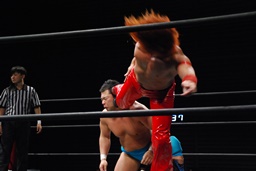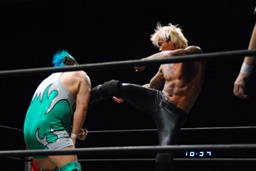 高尾ストンピング、ロープに振ってドロップキック(左写真)、カウント2。入江にタッチ。