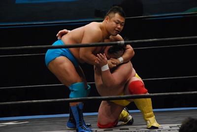 さらに首投げ(左写真)、カバー3回、伊橋は2で返す。