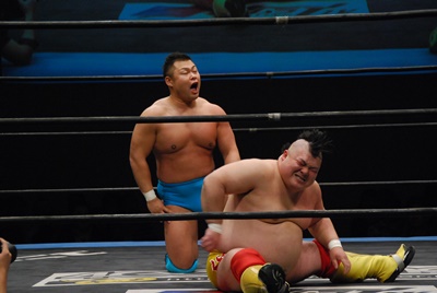 松永トミーボンバー(右写真)、カウント2。