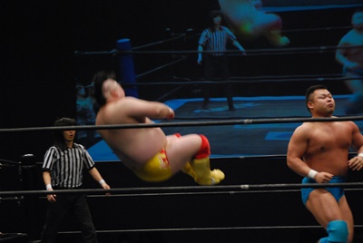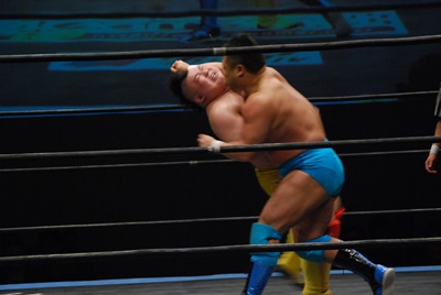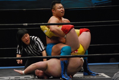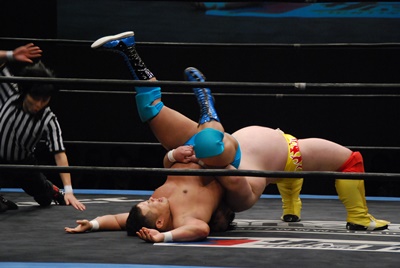 ボディスラム、コーナーに上ってダイビングボディプレス(左写真)、カウント2。5分経過。