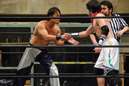 HARASHIMA「チェストー!」ミサイルキック(右写真)。ワンチューロはイワンにタッチ。