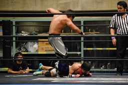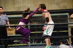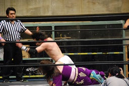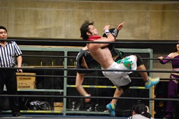 ワンチューロガットショット、ロープに飛ぶ、さくらカニばさみで倒し(左写真)背中をひっかく。