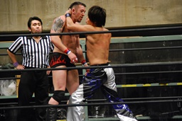 ワンチューロボディスラム狙う、ウラノブロック。ワンチューロエルボー、ロープに飛ぶ、ウラノカウンターのドロップキック(左写真)、HARASHIMAにタッチ。