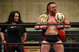イワンがワンチューロにネックハンギングボム、2冠をアピール(左写真)。