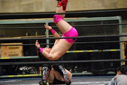 佐藤ロープに振る、高尾切り返してドロップキック、佐藤ロープにつかまってスカす、佐藤ロープに飛ぶ、高尾前転からドロップキック(右写真)、石井にタッチ。