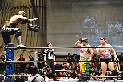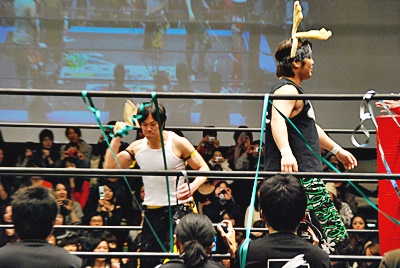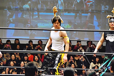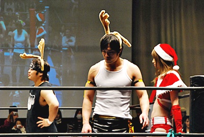 KUDOとウラノはトナカイの角を付けてリングイン(右写真)。KUDOは角を外してヌンチャク代わりに。