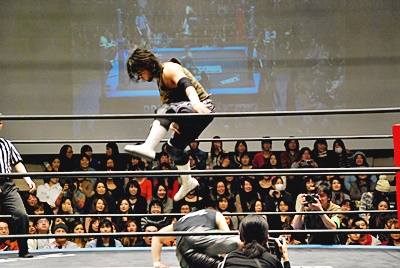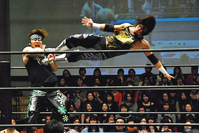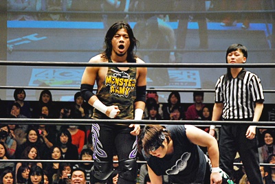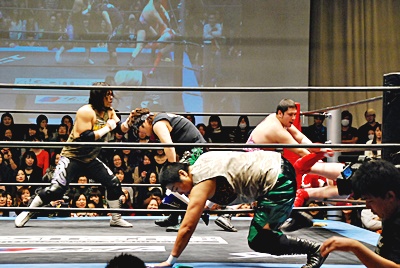 佐々木ロープに振ってドロップキック(左写真)、GAMIにタッチ。