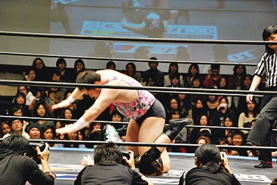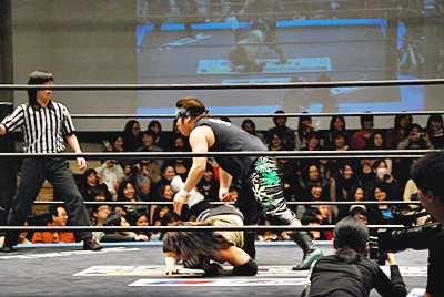 アントンウラノに首投げからニースタンプ(右写真)、カバーはKUDOがカット。