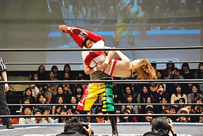 アントンボディへのパンチ連打からボディスラム、ウラノブロックして逆にボディスラム(左写真)、赤井にタッチ。5分経過。