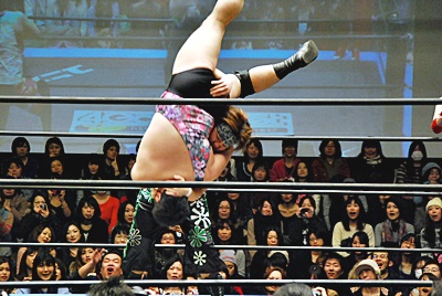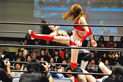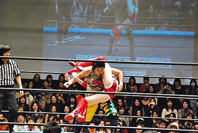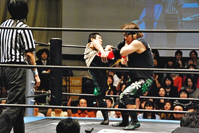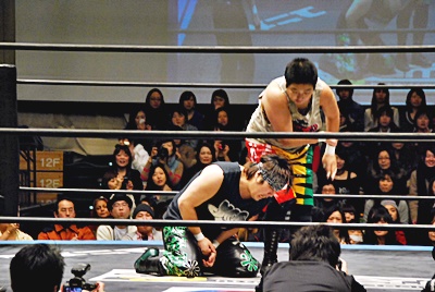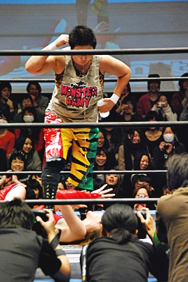 GAMIが赤井をロープに押し込み(右写真)反動で飛ばす。