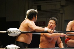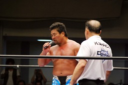 健介「やるか!」とだけ言うとマイクを中嶋に託してリングを下りる。