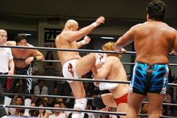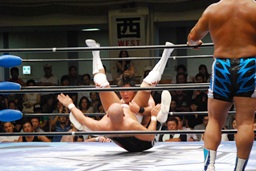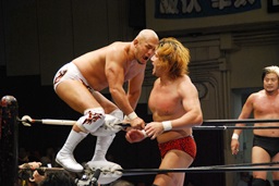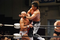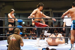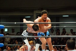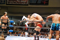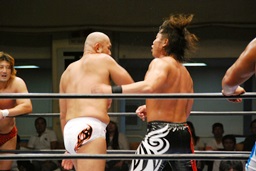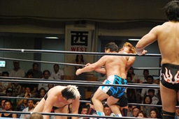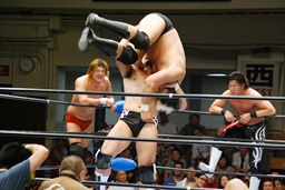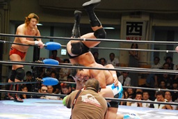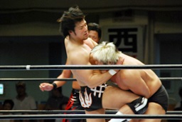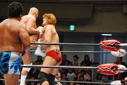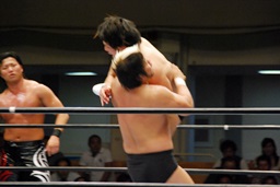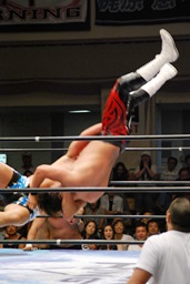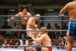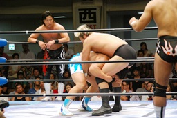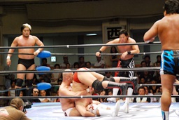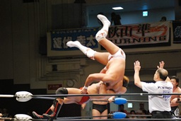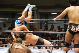 潮アブレーンバスター狙う、諏訪魔切り返して逆に投げる(右写真)、大森にタッチ。