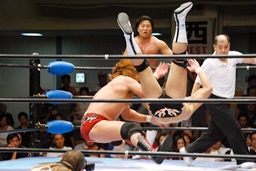 諏訪魔は潮アのラリアットブロック、しかし潮アはケサ斬りチョップからスーパーキック(左写真)、カウント2。
