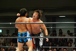 健介ラリアット(右写真)、宮原カウント1で返す。もう一発、今度はカウント2。
