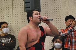 アントンボディへのパンチからボディスラム(左写真)、カバー、カウント2。最初のシンギングタイム、アントンに観客から与えられたお題は「坊主頭」。