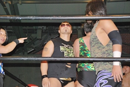 アントン首投げからフィストドロップ(左写真)、カウント1。フェースロックからチョーク攻撃、旭がカット。アントンは佐々木にタッチ。