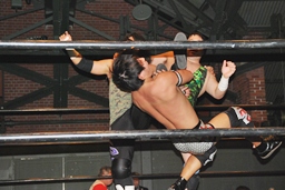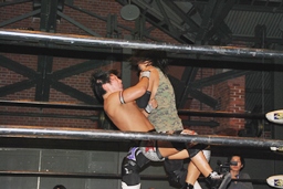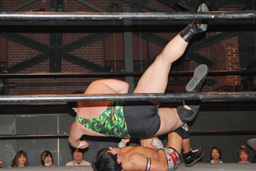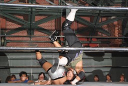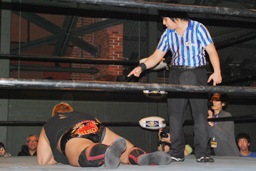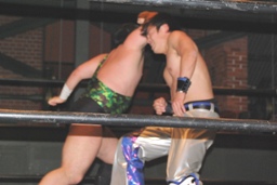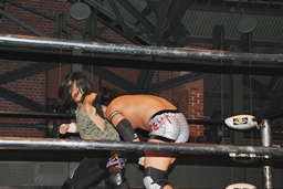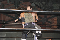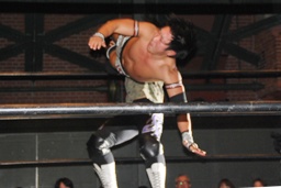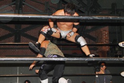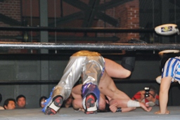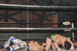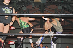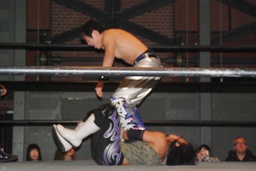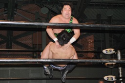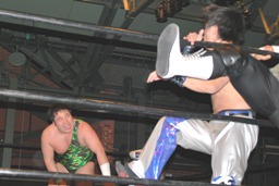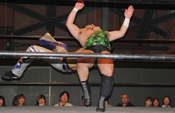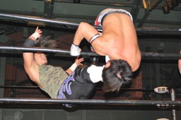 佐々木ロープに振ってドロップキック(左写真)、カウント2。スリーパー、リリースしてボディスラム、アントンにタッチ。5分経過。