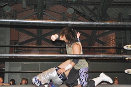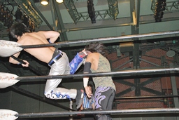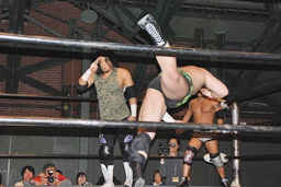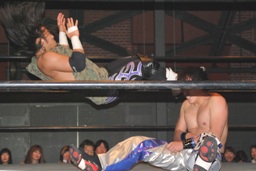 佐藤が首投げ、旭がトップロープ越しのダイビングフットスタンプ(左写真)。