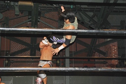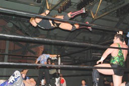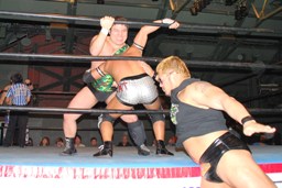 旭ロープに飛ぶ、佐々木キャッチしてケブラドーラ・コン・ヒーロ(左写真)、アントンにタッチ。
