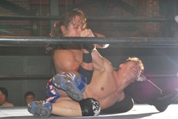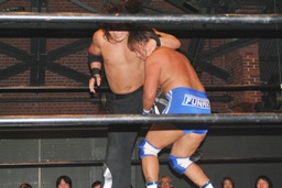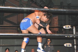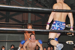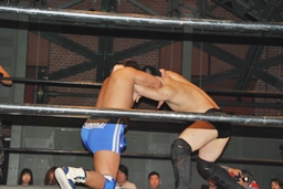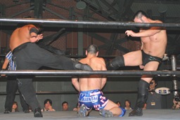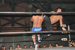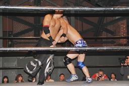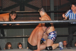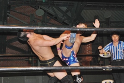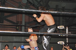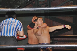 バックの取り合い、真霜腕を取る(右写真)、TAKA切り返す。TAKAロープに振る、真霜ブロックしてキチンシンク、TAKA場外エスケープ。